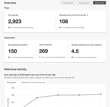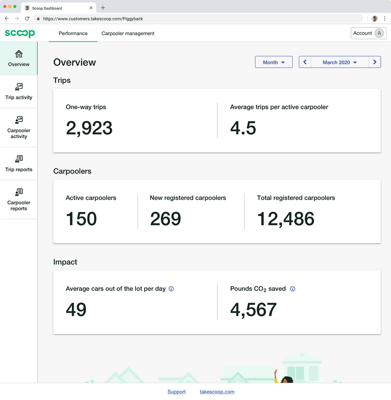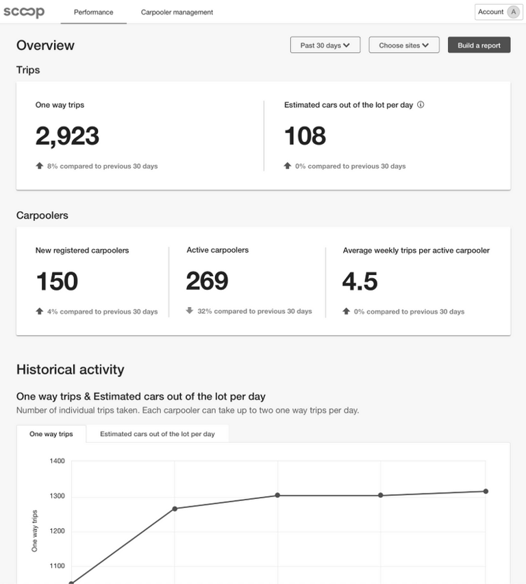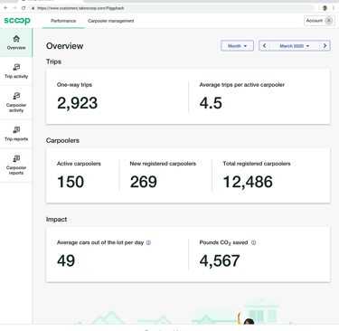 Provide customers with both a high-level overview and more detailed graphs that show employees' usage of their transportation program and highlight how Scoop carpools were driving impact towards customer goals.