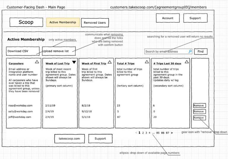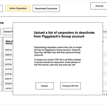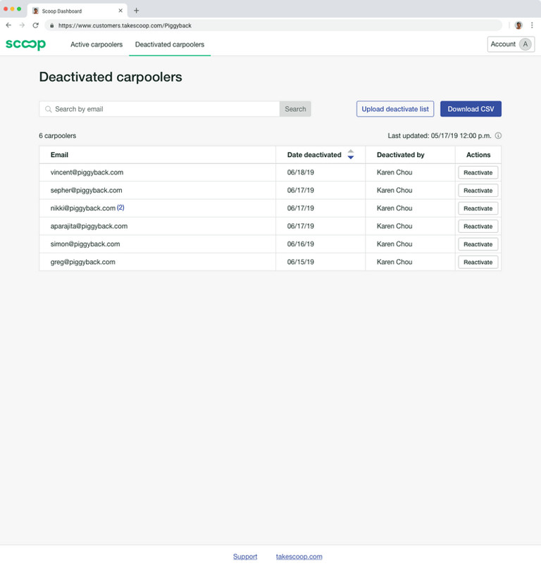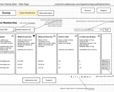 First, I developed a set of designs to unblock our backend engineers who would need lead time to build the systems that provide data to the dashboard. We focused on the first feature that required complex custom backend work, which was user management, specifically the ability to remove terminated employees from having access to carpool benefits paid for by their former employer. We prioritized this feature because we had several pending contracts where customers required this feature in order to sign with Scoop.