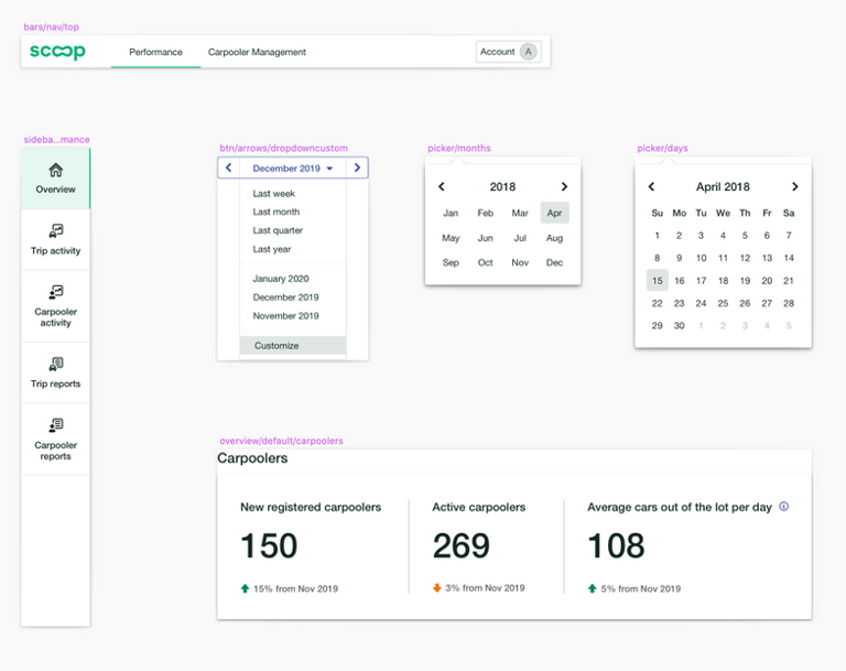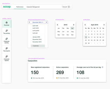 We customized the Bootsketch library with Scoop colors from our mobile component library and documented custom components as needed. For example, I created custom sidebar, top bar, metric summary cards, and date picker components.