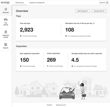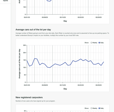 Information about how many cars were being removed from parking lots was especially valuable and encouraged customers to renew their Scoop contracts and in some cases agree to a contract up-sell. One customer had the ability to rent out empty parking spaces and so in addition to program incentives offered through Scoop they started paying their employees directly to use the service.