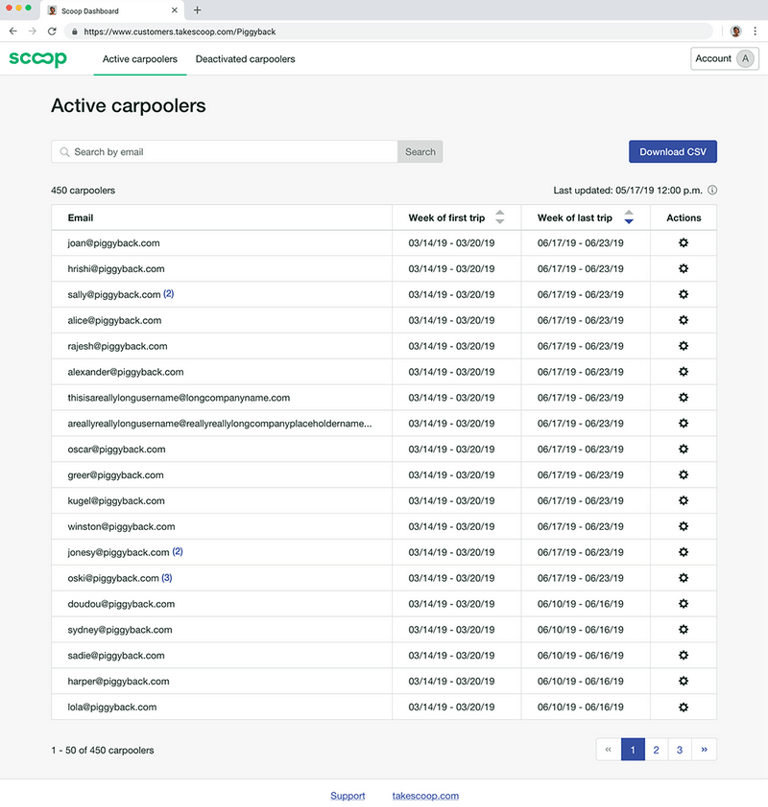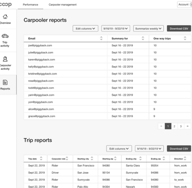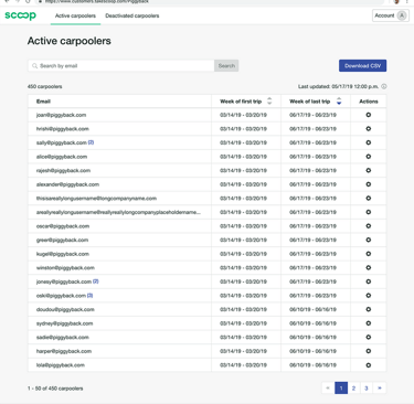 Enable customers to to substantiate their Scoop invoice, see where carpooling was working well for employees, and export information for customer analysis in other business intelligence tools.