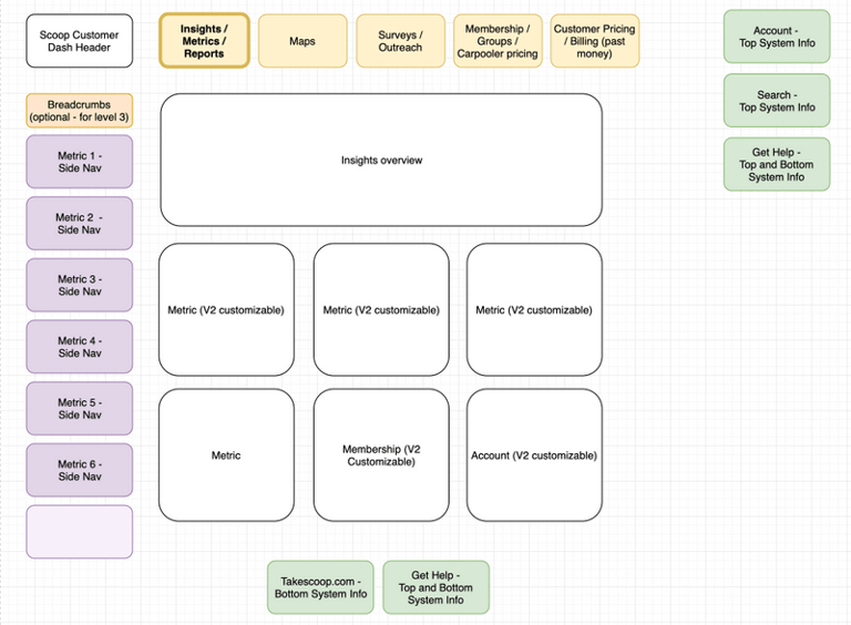 The second set of designs we made were a future facing plan for the layout of the site. I reviewed publicly available eye tracking research that focused on website users expectations for where to find a page's home link, navigation, system information, and content title. I also organized the feature insights from our generative research into categories, so that everything we planned on building long term would fit together into a cohesive system.